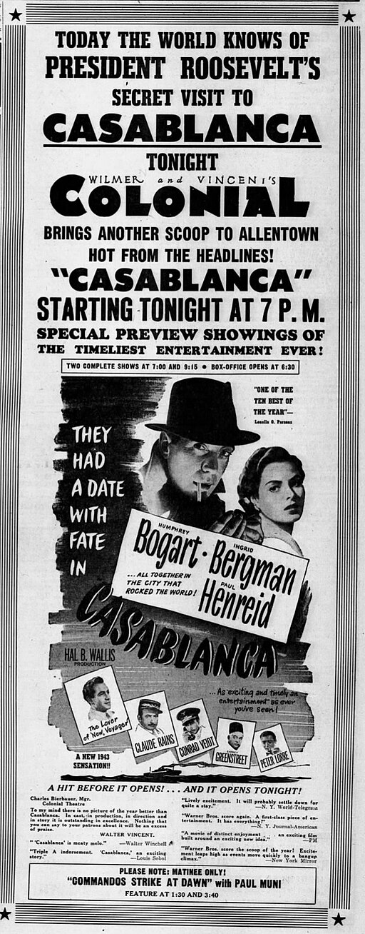 | Main cast | Humphrey Bogart - Ingrid Bergman - Paul Henreid - Claude Rains - Conrad Veidt - Peter Lorre |